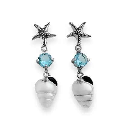 BRINCO EM PRATA925 - ESTRELA DO MAR, ZIRCÔNIA ÁGUA MARINHA E CONCHA