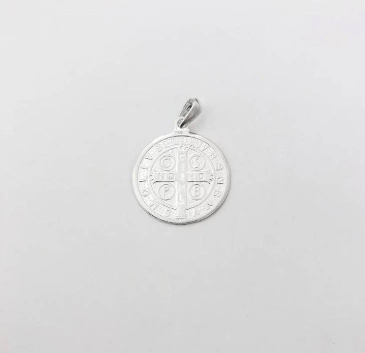 A Medalha de São Bento é lindíssima e com brilho incomparável. Ela é inteiramente trabalhada na prata 925 branca. Sua frente tem a imagem de São Bento e o verso a Cruz Sagrada com oração. Ela é muito usada pelos religiosos como forma de devoção e para afastar o perigo, o poder do inimigo e livrar de calúnias.