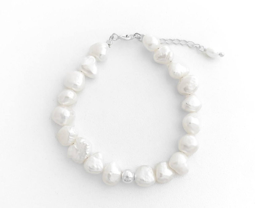 PULSEIRA EM PRATA925 - PEDRAS NATURAIS PÉROLA AMASSADA 16CM + 3 CM EXT